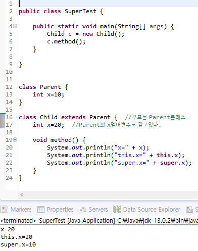위 사진을 보면, 같은 이름의 멤버변수(--> x)가 조상 클래스인 parent에도 있고 자손 클래스인 Child클래스에도 있을 때는 super.x와 this.x는 서로 다른 값을 참조하게 된다. super.x는 조상 클래스로부터 상속받은 멤버변수 x를 뜻하며, this.x는 자손 클래스에 선언된 멤버변수를 뜻한다.