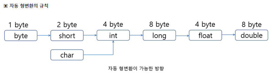 - 작은 데이터 타입에서 큰 데이터 타입으로 형변환하여도 데이터 손실없이 그대로 보존될 수 있기 때문에 자동 형변환이 일어난다.